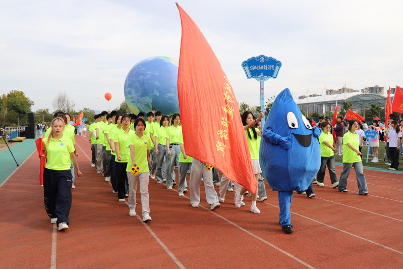 开幕式上,我院方阵步伐铿锵,旗帜高扬。60名学子身着统一服装有序行进,通过草木造型、蓝色星球模型及“低碳未来”标语,生动彰显学院专业特色。“厚德博学,生态城环!赛场砺行,共绘新篇!”嘹亮的口号响彻赛场,传递出服务美丽中国建设的坚定信念。