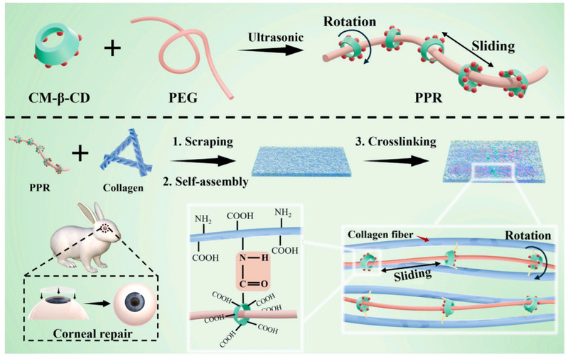 面对全球角膜供体短缺及传统修复材料力学性能不足的临床困境,团队开发出一种具有机械自增强效应的柔性交联胶原膜(COL-PPR)。该材料创新性地引入聚乙二醇-羧甲基-β-环糊精构筑的聚准轮烷(PPR)作为柔性交联剂,通过动态滑动交联点设计,解决了传统胶原材料拉伸强度低、疲劳抗性差的难题。COL-PPR可承受超过5200次循环拉伸,应力增强率高达1758%,与天然角膜力学性能高度匹配。兔眼板层角膜移植实验验证,该材料术后7天即可实现角膜上皮完全覆盖,28天恢复正常眼表形态,365天随访显示角膜透明度、曲率及生物力学性能均接近健康角膜,且有效抑制炎症反应与新生血管生成。其优异的光学性能和细胞相容性,为角膜盲患者提供了新型生物替代材料,有望缓解角膜供体短缺的全球医疗危机。