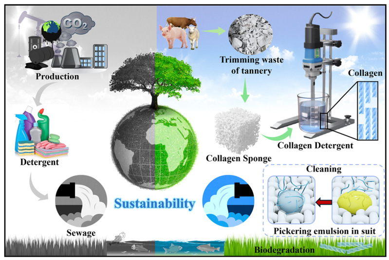针对传统石油基洗涤剂污染环境、刺激人体的突出问题,团队受亚洲传统淘米水清洁智慧启发,研发出一种以天然胶原为核心的无表面活性剂绿色洗涤剂。该洗涤剂以制革工业副产物——脱灰牛皮边角料为原料,通过温和提取工艺获得天然胶原,无需化学修饰即可直接使用,实现了生物质废料的高值化利用。其创新清洁机制源于胶原固有的两亲性和纤维结构,在油污表面原位形成Pickering乳液,通过强大的界面吸附作用牢牢包裹并去除污渍,清洁效率高达90%,与市售洗涤剂性能相当。更值得关注的是,该洗涤剂展现出卓越的生物安全性,解决了传统洗涤剂生态污染的痛点。成本低廉,具备显著的产业化潜力,为循环经济下的绿色清洁产品开发提供了新范式。