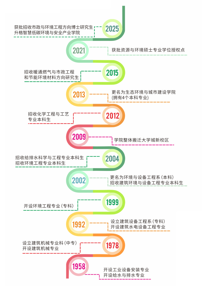 生态环境与城市建设学院办学历史溯源于1958年福建建筑工程专科学校开设的工业设备安装专业和给水与排水专业。1978年设立建筑机械专业科(中专),开设建筑机械专业,1992年成立建筑设备工程系,1999年开设环境工程专业,2002年更名为环境与设备工程系,2013年组建成立生态环境与城市建设学院,2015年开始先后招收暖通燃气与市政工程、资源循环科学与工程等方向硕士研究生,2021年获批资源与环境硕士专业学位授权点,并于2022年开始招生。2025年获批招收市政与环境工程方向博士研究生,升格智慧低碳环境与安全产业学院。学院历经60余年发展,在建筑机电、工程设备和生态环保等领域培养了8000余名各类人才,为区域经济建设和社会发展作出了突出贡献。